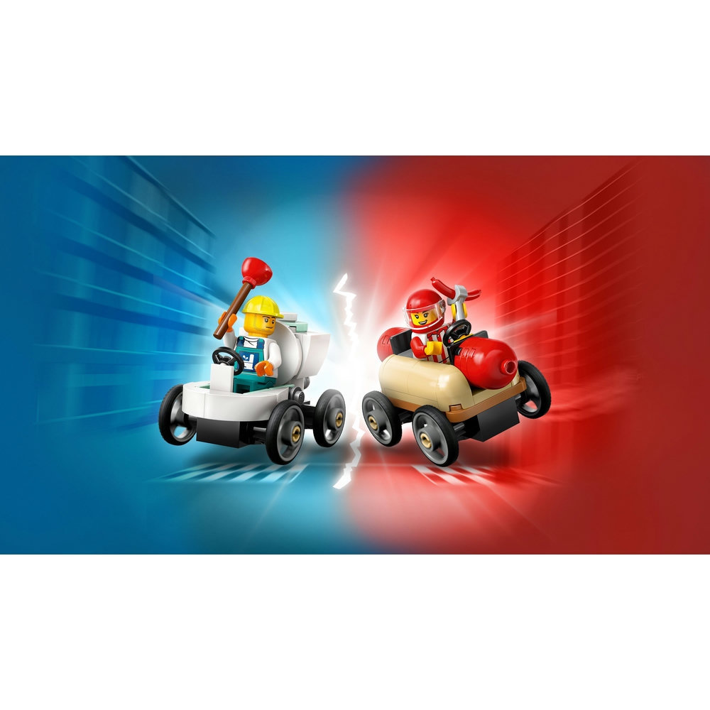 Buckle up for a high-speed soapbox showdown with the LEGO City No Limits: Race Car Ramp Track! Urban racing has arrived in LEGO City and the streets are abuzz with excitement. Pit the hot dog and toilet soapbox cars at the top of the giant ramp, press the lever and let the race begin! Who will cross the finish line first – the plumber or the hot-dog seller? Prepare to ramp up the action!