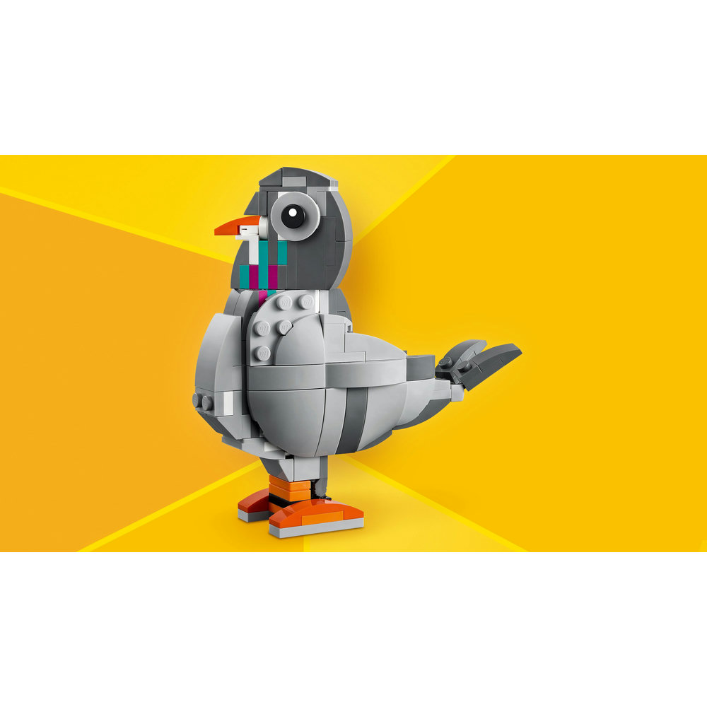 This is the perfect LEGO building set for pet-lovers! Build a fun-loving cat, who plays with a ball of yarn and a toy mouse before snacking from its food bowl. Later, rebuild it into a cute dog who chews on his bone, or rebuild it again into a curious pigeon with a rotating head, who loves to peck at breadcrumbs. The pet fun never stops with this amazing 3in1 set!