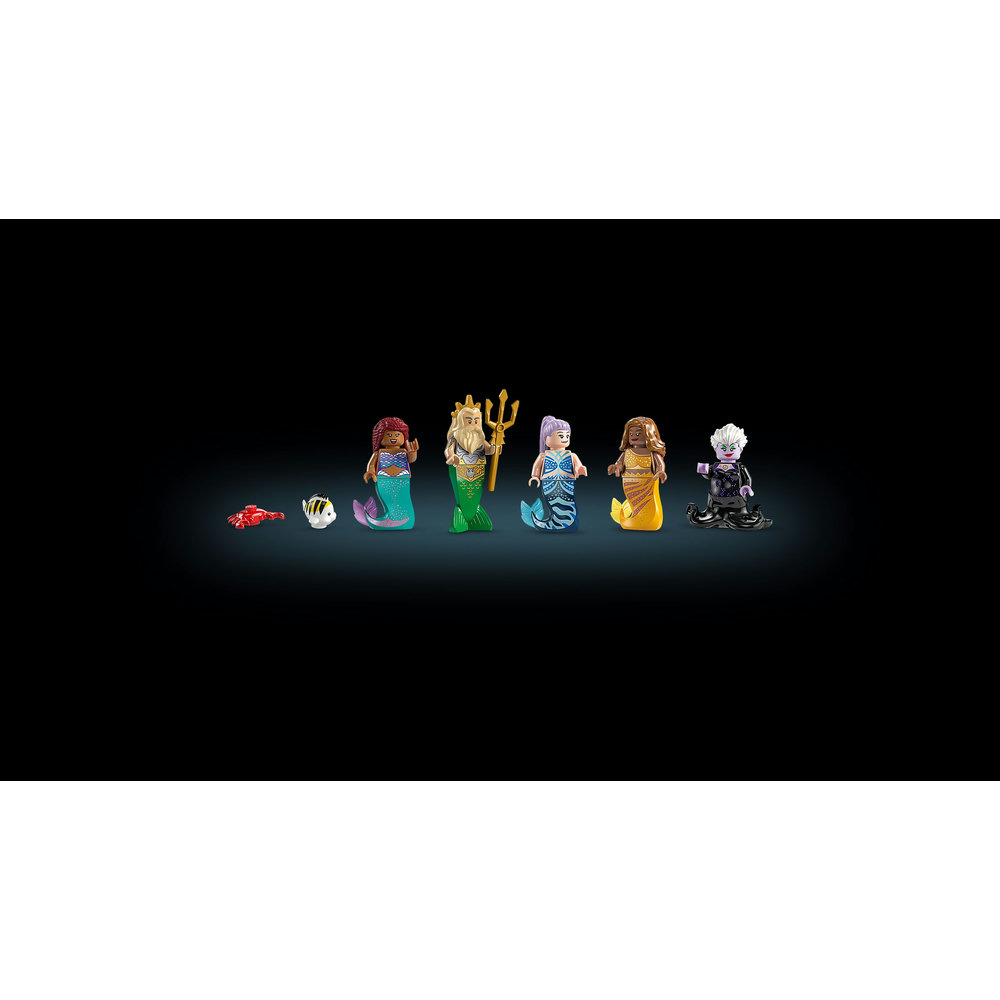 The set includes minifigures of Ariel, Prince Eric, King Triton, Sebastian, Flounder, and Ursula, each with their own unique design and accessories. With detailed facial expressions and perfectly crafted outfits, these minifigures are sure to delight fans and collectors alike. The set also comes with a buildable Sebastian figure, complete with moving arms and a hidden storage function for his musical instrument.