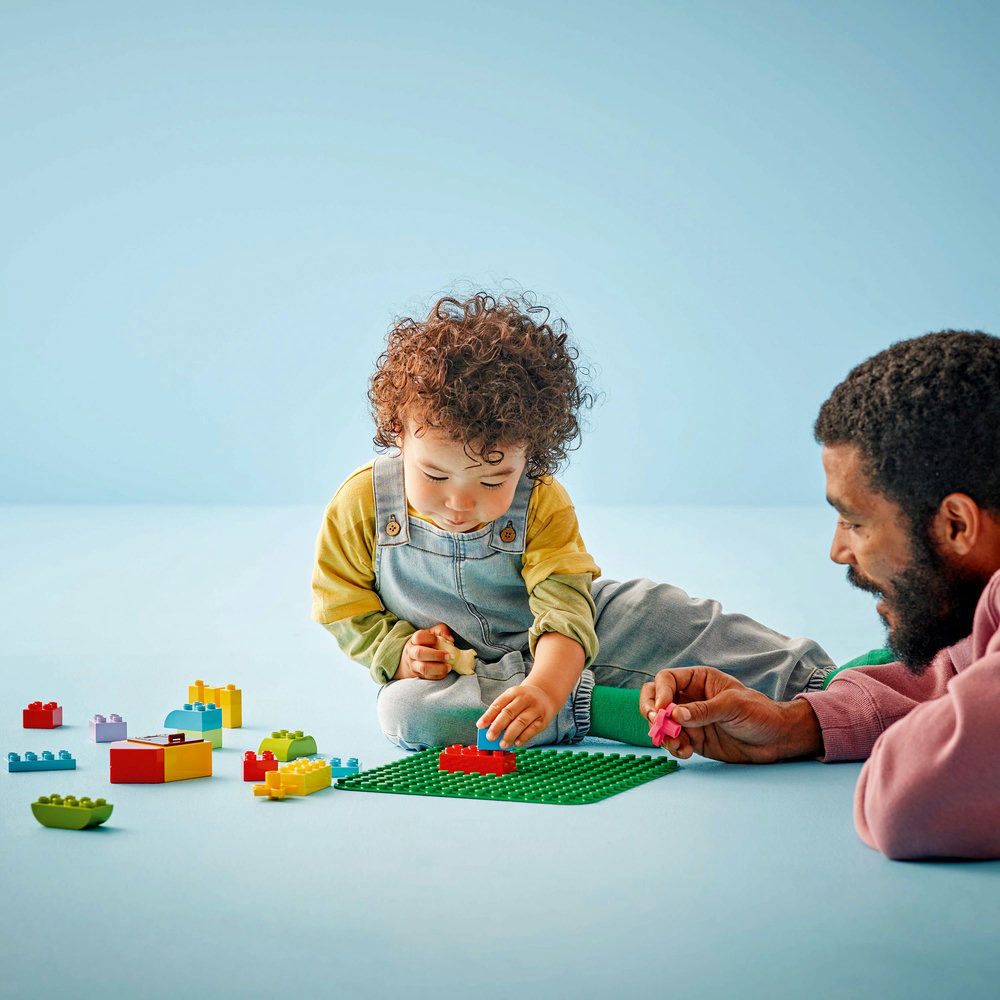 This 24×24-stud green kids’ display base, measuring over 25 cm (9 in.) square, is the ideal starting point for toddlers’ creative play. It holds bricks firmly at any angle (even upside down!) and opens up an endless world of imaginative play possibilities: from grassy gardens to exotic jungles and steep mountainsides to cool, green, flying machines. And, when the building stops, the LEGO DUPLO baseplate gift provides the perfect solution for a collapse-free way to transport and display kids’ creative building.