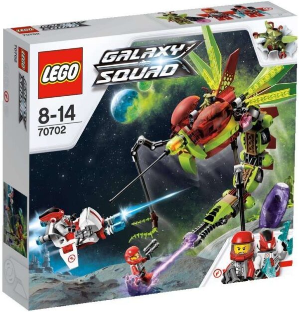 Neutralize the Warp Stinger with Billy Starbeam’s speederbike! Stop the angry alien mosquitoid behind the wheel of the fearsome Warp Stinger! It’s using the Warp Stinger’s shooting function to attack the Galaxy Squad heroes. Go after it with red team leader Billy Starbeam and his speederbike! Watch out for the Warp Stinger’s sticky cocoon trap! Fire the detachable blasters and team up with his robot sidekick to save the world from those overgrown bugs! Be ready for a serious bug battle against the Warp Stinger’s cocoon, moving wings, detachable gun and shooter function. Includes 3 minifigures with assorted weapons: Billy Starbeam, robot sidekick with jet pack and winged alien mosquitoid.