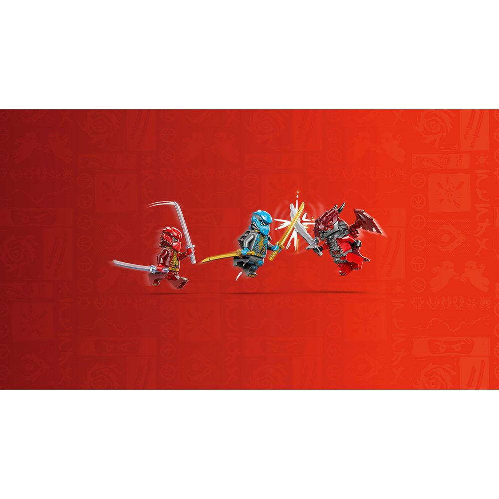 Join forces with Kai and Nya as they hurtle through a ferocious storm. In the skies above the NINJAGO world, Nya is piloting her flying motorcycle while Kai is at the controls of his mech as together they form an awesome combined ninja vehicle! They also need to use their armoury of katana swords and shooters to take down a dangerous Dragonian Warrior beneath them. Ninja teamwork must triumph!